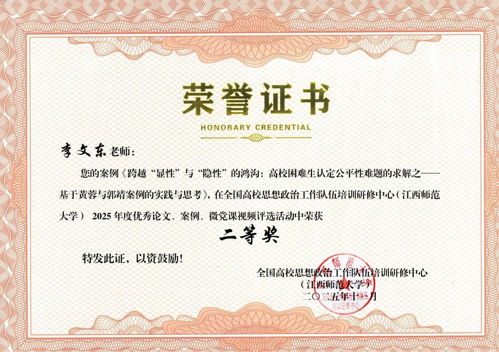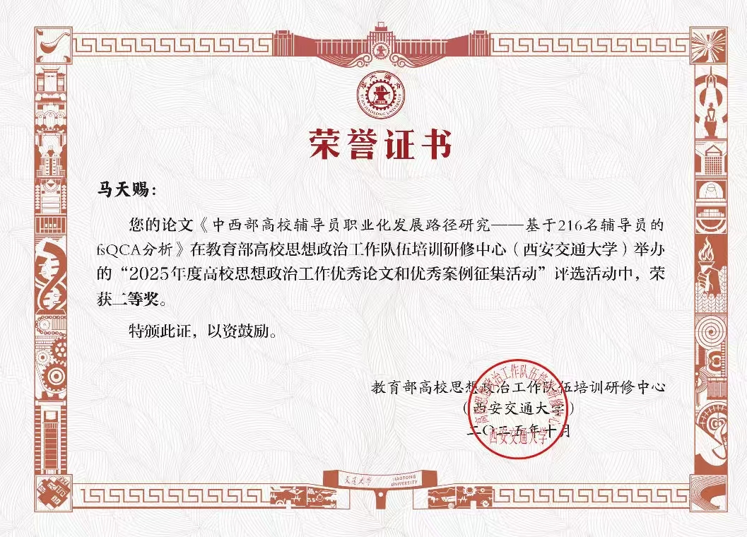 此外,我校李文东老师在教育部高校思想政治工作队伍培训研修中心(江西师范大学)组织的2025年度优秀工作案例评选中荣获二等奖。马天赐老师在教育部高校思想政治工作队伍培训研修中心(西安交通大学)举办的2025年度高校思想政治工作优秀论文和优秀案例征集评选中荣获二等奖。