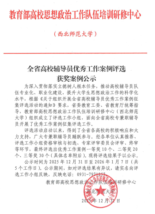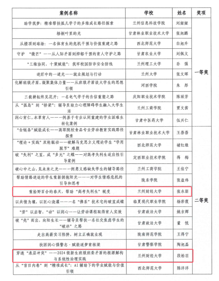 近日,由省委教育工委、省教育厅统筹指导,教育部高校思想政治工作队伍培训研修中心(西北师范大学)组织的2025年甘肃省高校辅导员优秀工作案例评选结果揭晓。我校张永丽、段柏羽荣获二等奖,郭宇婧、马诗尧荣获三等奖。