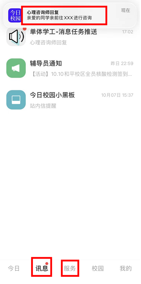 第五步:当心理咨询师收到预约消息后会进行回复,回复内容将会发送到本人的今日校园“讯息”内。