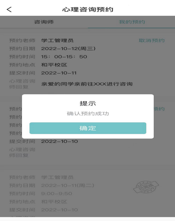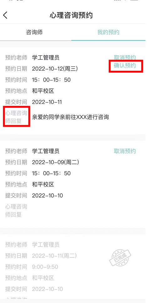 注意:当本人收到回复后需要及时在“服务”栏里的“心理咨询”模块进行“确认预约”的操作,确认完后便可在约定的时间内进行咨询。具体线上咨询与预约心理咨询师确认后进行。