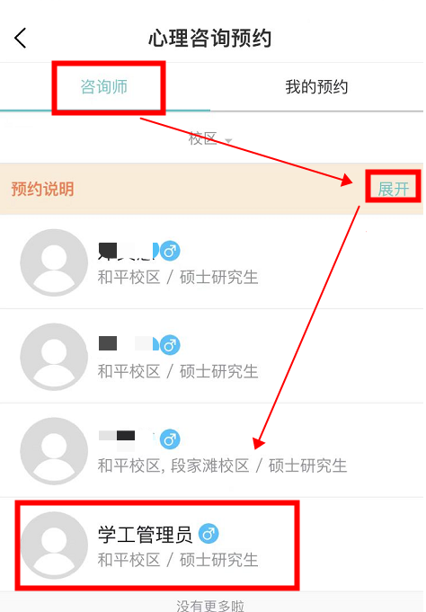 第一步:在“今日校园”APP。找到“心理咨询模块“,进入后查看“预约说明”仔细阅读预约说明后,选择心理咨询师。