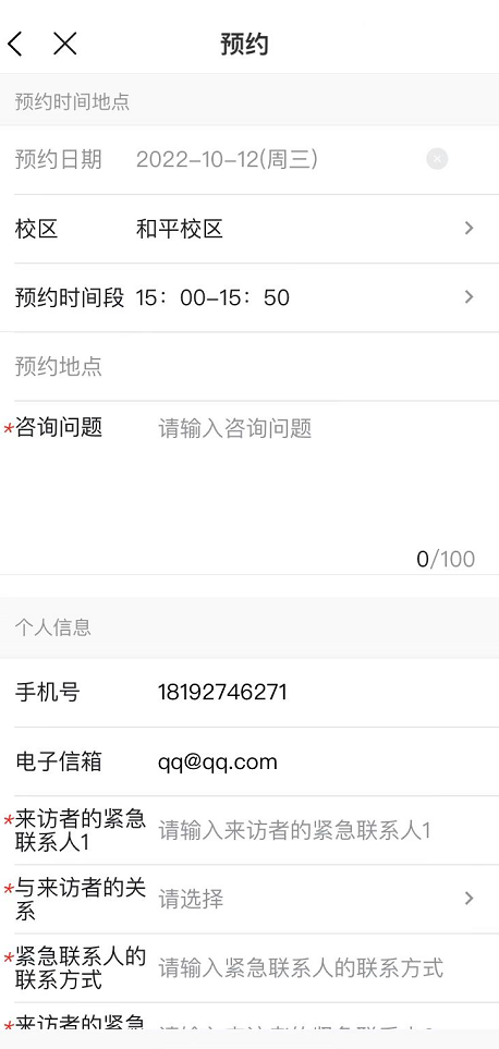 第四步:填写主要咨询问题及紧急联系人联系方式后点击提交按钮。