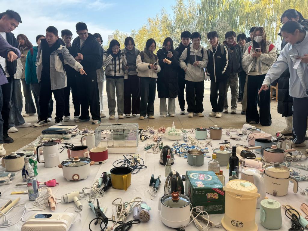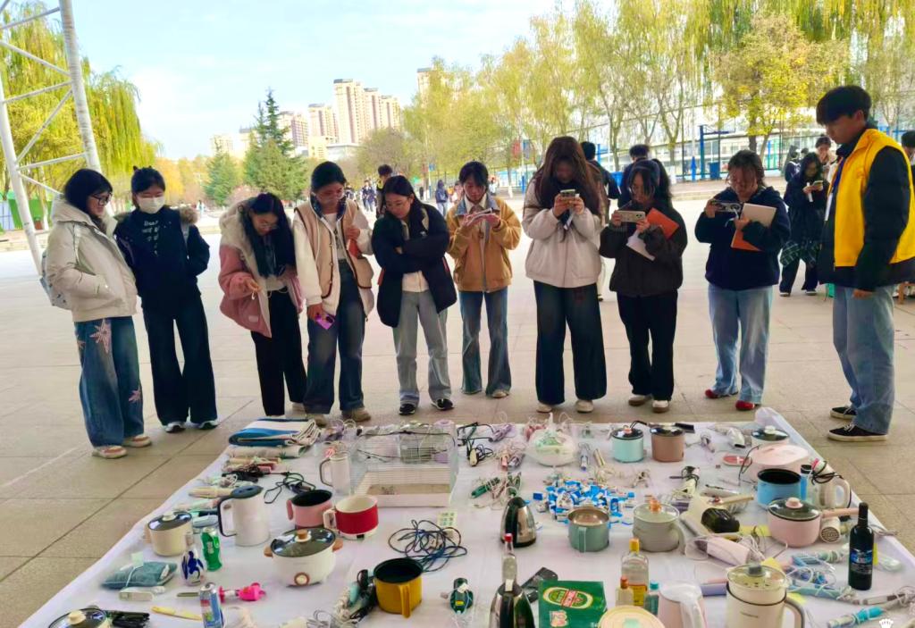 违禁物品“看得见”,直观敲响安全警钟。集中展示了宿舍日常检查走访中查收的违禁物品,包括卷发棒、电夹板、吹风机、电热毯、电热锅、烧水壶、麻将、酒品、宠物等,吸引众多同学驻足围观。大家围绕物品属性、违规原因纷纷好奇询问,有效激发了学生对宿舍安全的关注力。