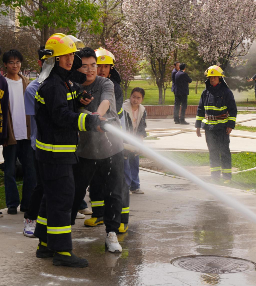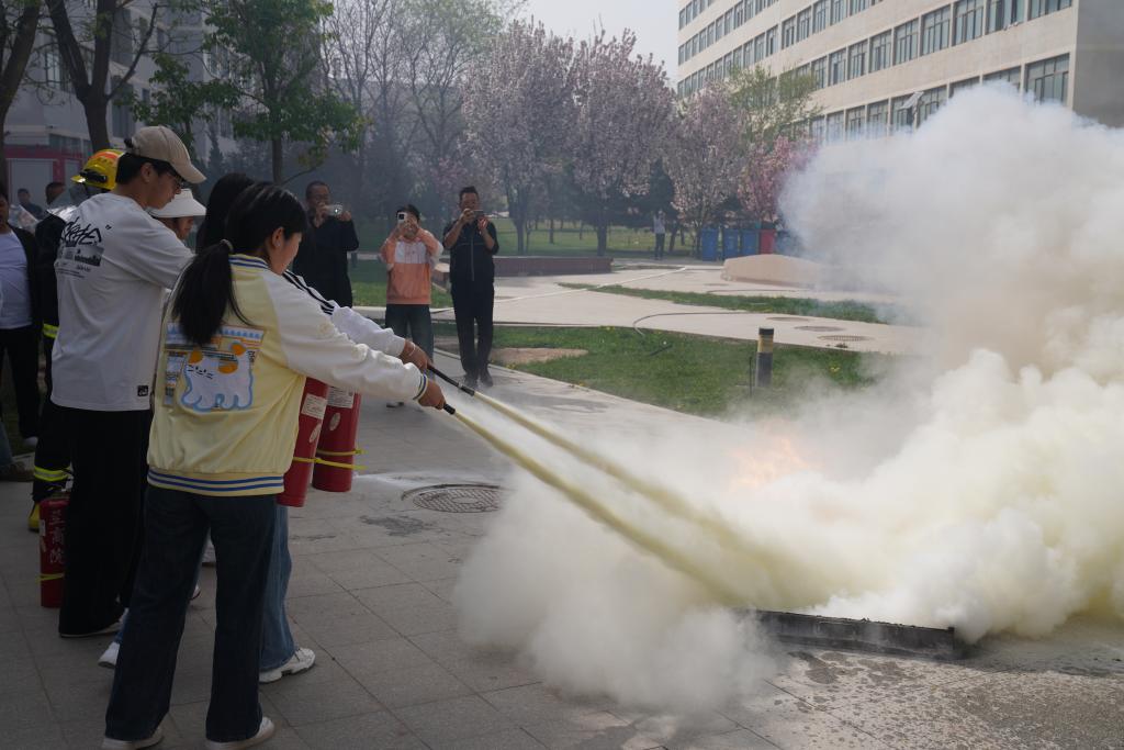 在消防队员的专业指导下,参演人员分组体验了干粉灭火器的实操灭火。“一提、二拔、三握、四压”——消防员现场演示了灭火器的正确使用方法,实际运用了室外消火栓进行了灭火,并强调“初期火灾扑救的黄金时间仅3分钟”。师生及从业人员轮流操作,通过实战演练掌握了灭火技巧。