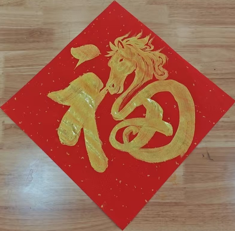 红纸铺展承雅韵,笔墨飞扬贺新春。书法协会学子铺展红纸、提笔蘸墨、运笔挥毫,一幅幅笔力遒劲、寓意吉祥的春联跃然呈现。“随喜自在心常乐,诸事顺遂福有余”“立德树人培俊秀,笃行致远谱华章”等联语,既饱含对新春的美好憧憬,也承载对校园生活的真挚祝福,每幅作品都蕴含着浓浓的年味与深情。同时,马年主题“福”字创作同步开展,以方正饱满的“福”字为核心,辅以笔锋刚劲的昂首骏马写意造型,生动传神的作品吸引众多学子驻足观赏、请教笔法。