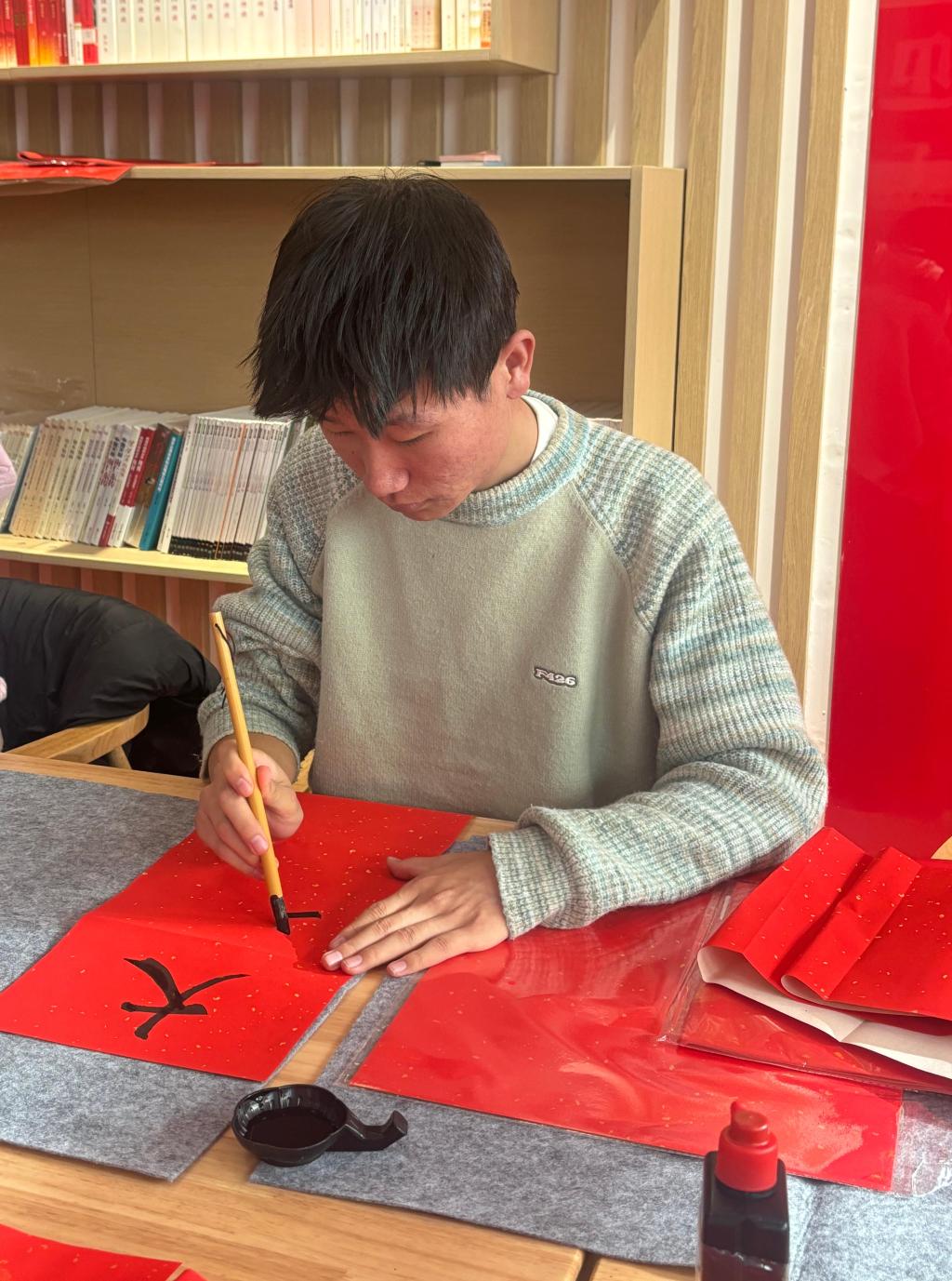学子挥毫抒心意,邻里互动暖寒冬。在书法协会学子的指导下,现场学子踊跃参与春联书写,规范握笔姿势、钻研笔画走势。初次尝试写春联的学子兴致盎然,认真临摹练习,字迹虽略显稚嫩,却满含对新年的真挚期许。闻讯而来的社区学子或驻足观赏体悟书法艺术魅力,或主动上前挑选心仪春联内容,书法协会学子耐心对接需求,按需创作专属春联。不少学子表示,手写春联比印刷品更有温度,不仅深切感受到了传统文化的魅力,也让异乡求学的自己体会到了社区的温暖。